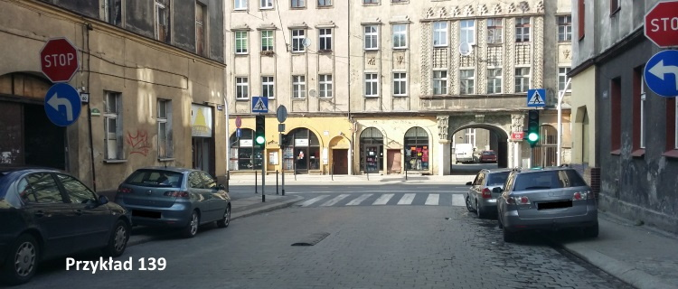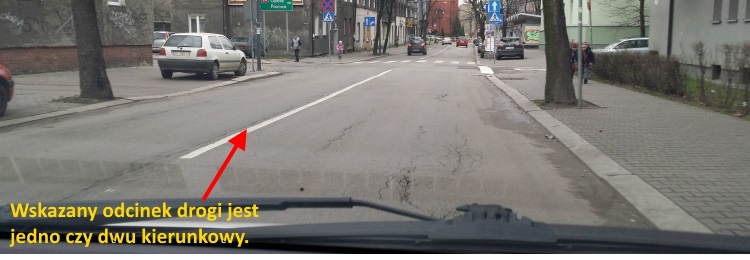 Przykłady – Jedziesz drogą jednokierunkową, linia przebiega przez całą szerokość drogi albo znaki są ustawione po obu stronach drogi.